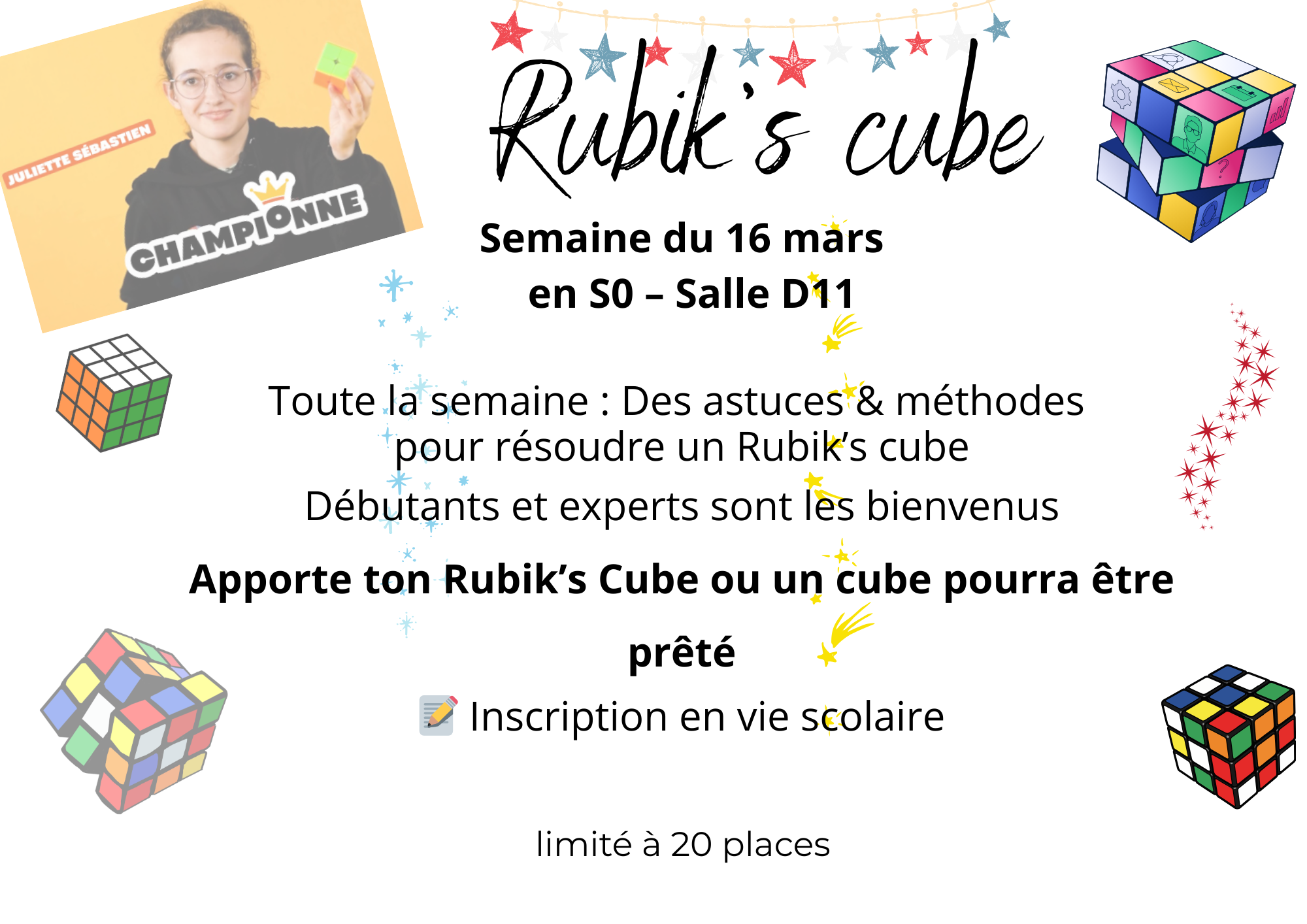 Sans oublier l’atelier Magie et Rubik’s Cube en S0 : un moment ludique pour découvrir des astuces surprenantes et relever de nouveaux défis. Pensez à vous inscrire !